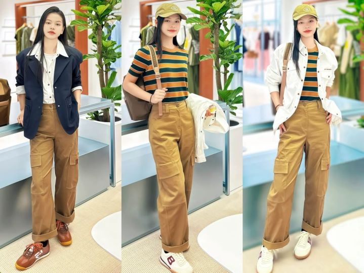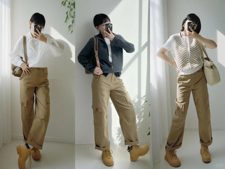 博主的这条工装恬逸裤,驼色系比拟温暖,可是作为下装的话,相对来说搭配难度会高少量,是以推选诟谇色的上衣,大要同色系,神志相呼应,无论是鞋子,依然上衣,同色系的单品会增多举座搭配颜色的和洽性,比拟紧闭易出错。