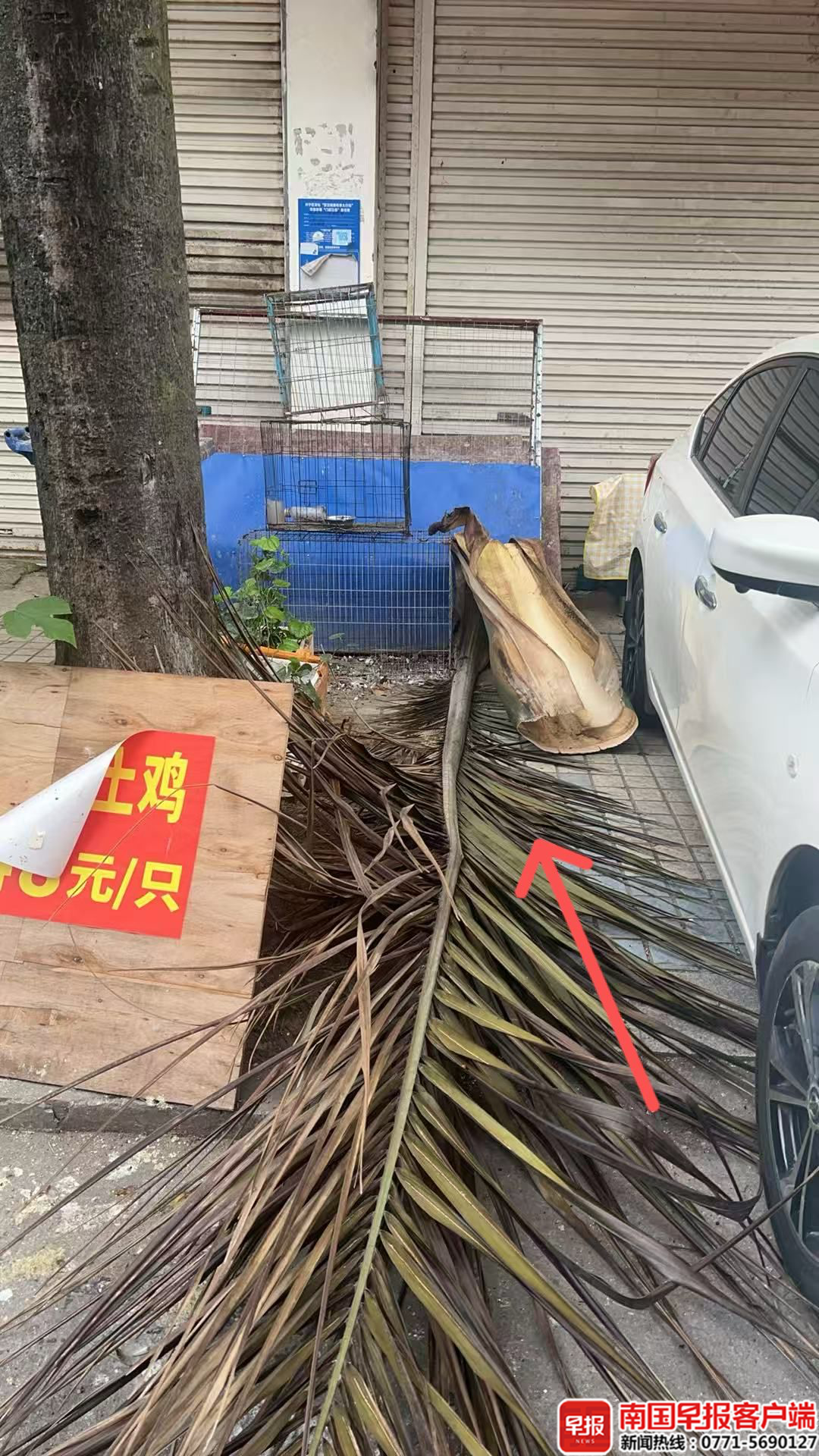3月26日下昼,南国早报全媒体记者在现场看到,贺女士泊车的位置两侧各有一棵高十几米的大王椰,树旁现场摆放有锥桶进行围挡,小区物管方在树上张贴有“落叶危机 淆乱泊车”的教导。