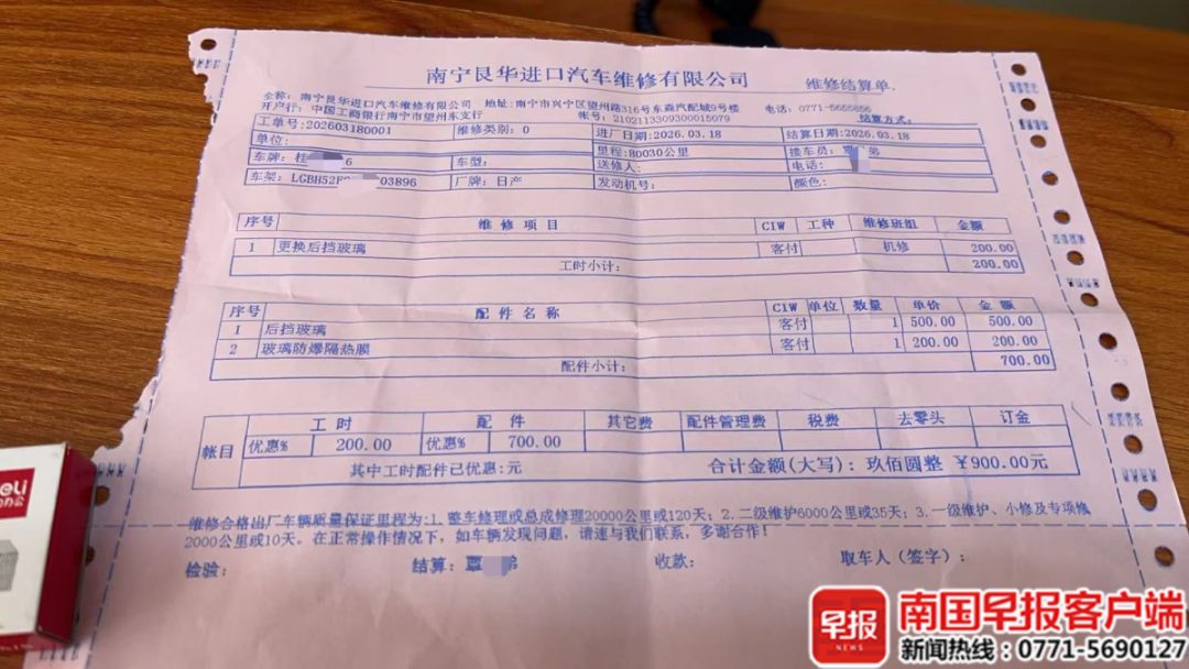 贺女士小车的维修单。南国早报全媒体记者 卢荻摄