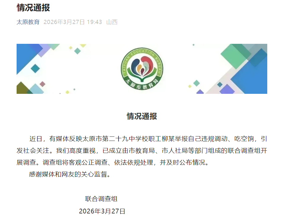 IM体育 太原市第二十九中学校员工柳某举报我方违法补救、吃空饷?官方通报