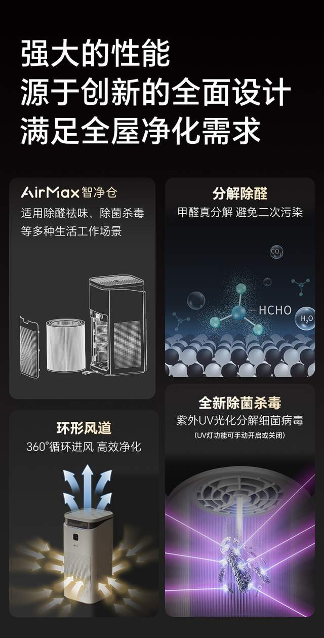 2. 万能净化:甲醛 / 雾霾 / 细菌 / 异味全惩处,一台顶三台