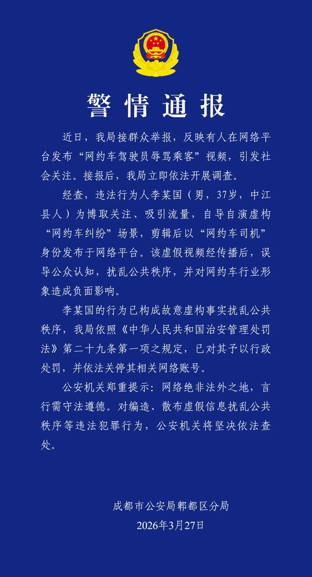 2026年3月27日,IM体育官方网站首页成王人市公安局郫王人永别局发布一则警情通报: