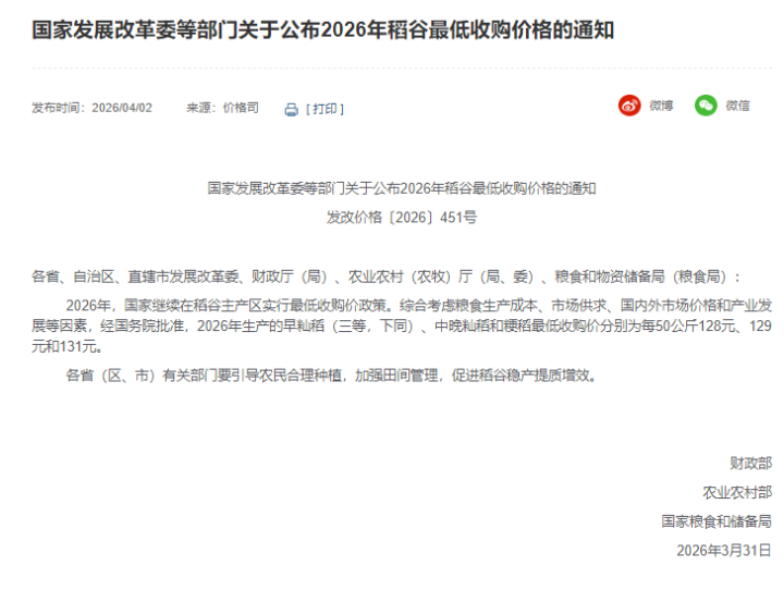 新华财经北京4月2日电国度发展矫正委、财政部、农业农村部、国度食粮和储备局共同发布对于公布2026年稻谷最低收购价钱的见告。