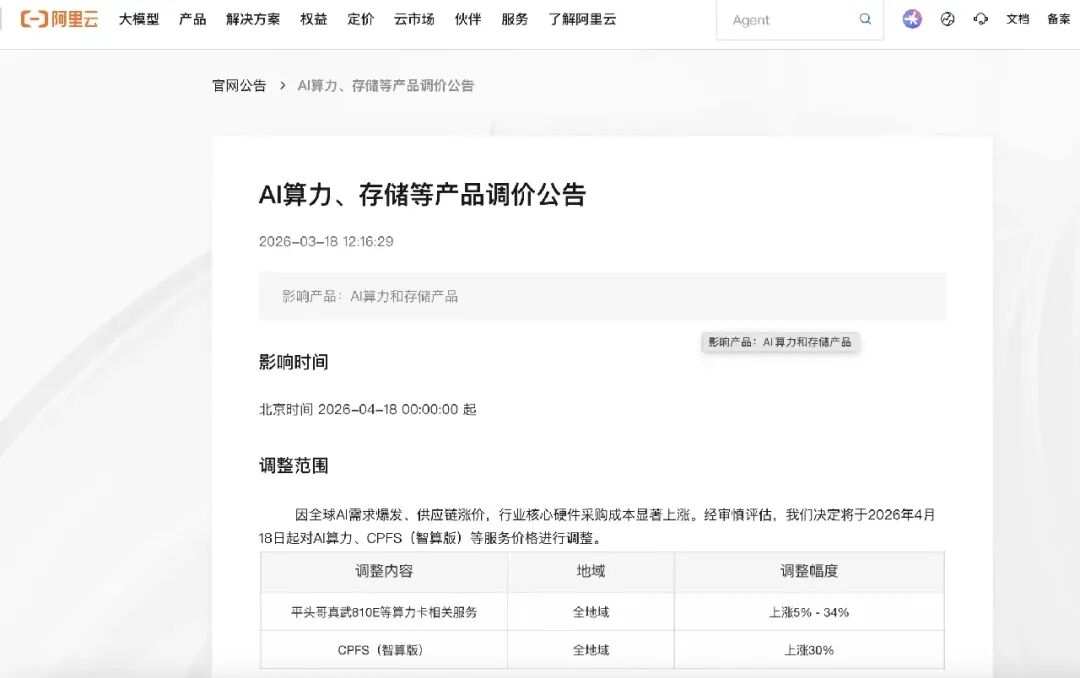 3月18日,阿里云在官网发布公告,AI算力、存储等居品调价。公告提到,因各人AI需求爆发、供应链加价,行业中枢硬件采购老本显贵高潮。经审慎评估,决定将于2026年4月18日起对AI算力、CPFS(智算版)等奇迹价钱进行鼎新。其中,平头哥真武810E等算力卡相关奇迹高潮5%-34%,CPFS(智算版)高潮30%。