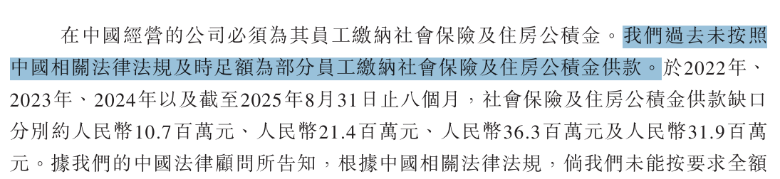 招股书明确承认:“公司未能王人备按照联系法律和规定为部分职工交纳社会保障和住房公积金。”2022年至2025年前8个月,社保和公积金缴费缺口悉数超亿元,且缺口范畴呈扩大趋势,该问题早在A股上市时代就已被监管关心,于今仍未透澈治理,组成公司中枢合规风险。