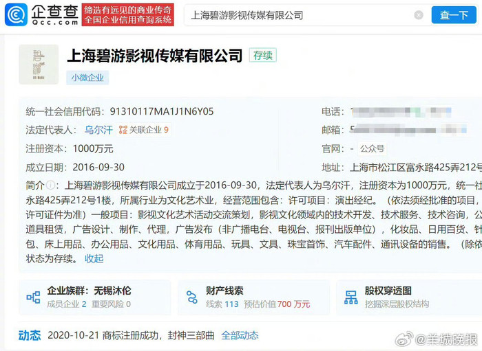 企查查APP浮现,侯雯元经纪公司上海碧游影视传媒有限公司成就于2016年9月,法定代表东说念主为乌尔汗,注册成本为1000万元,盘算推算鸿沟包含上演经纪、影视文化艺术行径相易考虑、公关行径考虑等,由无锡沐伦影视文化责任室、龙行天下(北京)文化传媒有限公司共同握股。猜你思看>>#姚晨侯雯元##男二以下AI演员##小S街头大哭##瞿颖恢复已婚##瞿颖胡兵恢复为什么没在全部#(大象新闻)(裁剪:张子皓;审签:周乐瑞)